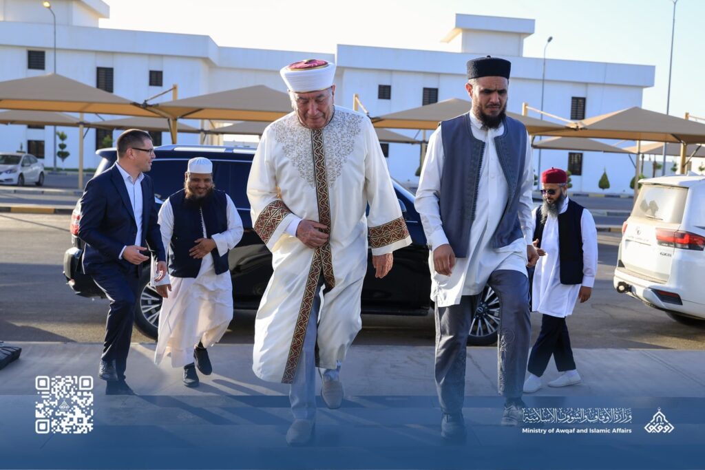 Minister of Endowments and Islamic Affairs Mr. Atef Abdul Wahid Al-Obaidi, Right, receives The Mufti of the Islamic Association of Belarus, Sheikh Abu Bakr Shabanovich in Benghazi, 27 September 2025. (Ministry of Endowment photo)
